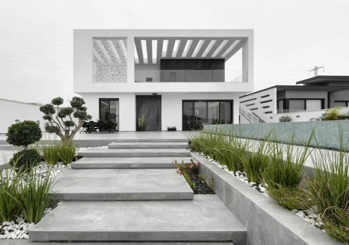 Construit sur un terrain en pente d’un dunam (1 000 m²), la maison comprend trois niveaux totalisant 350 m² :