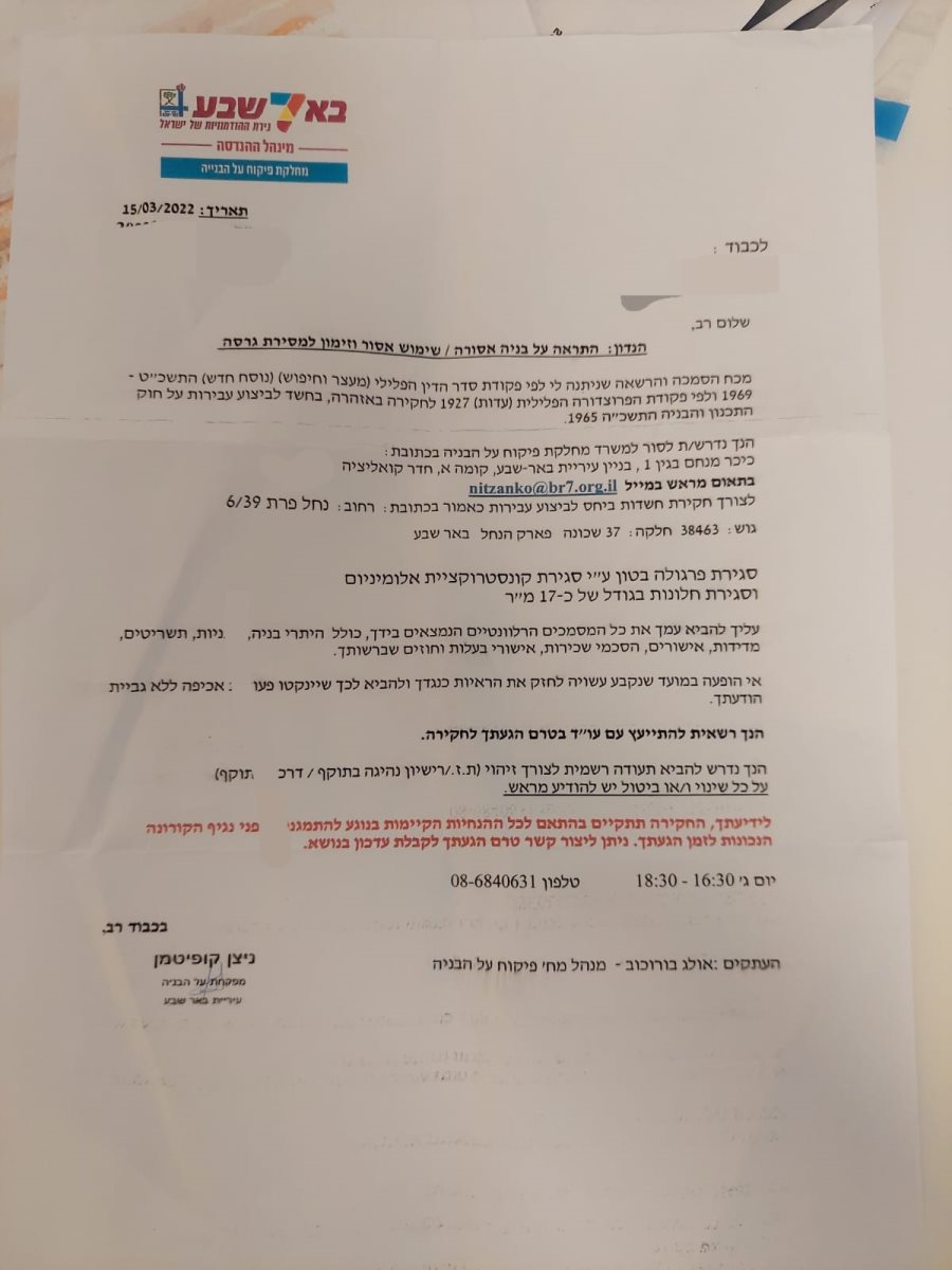 « Des revêtements tels que de nombreux habitants du quartier souhaitaient installer existent désormais sur des dizaines de milliers de balcons dans des maisons de Beer Sheva. Si vous vous promenez désormais dans Neve Ze’ev, Ramot et le quartier 9, vous verrez d’innombrables balcons de maisons où est installé exactement le même revêtement (PVC), ce qui soulève la question de savoir pourquoi la loi n’est pas appliquée de la même manière dans tous les quartiers de la ville. ? »