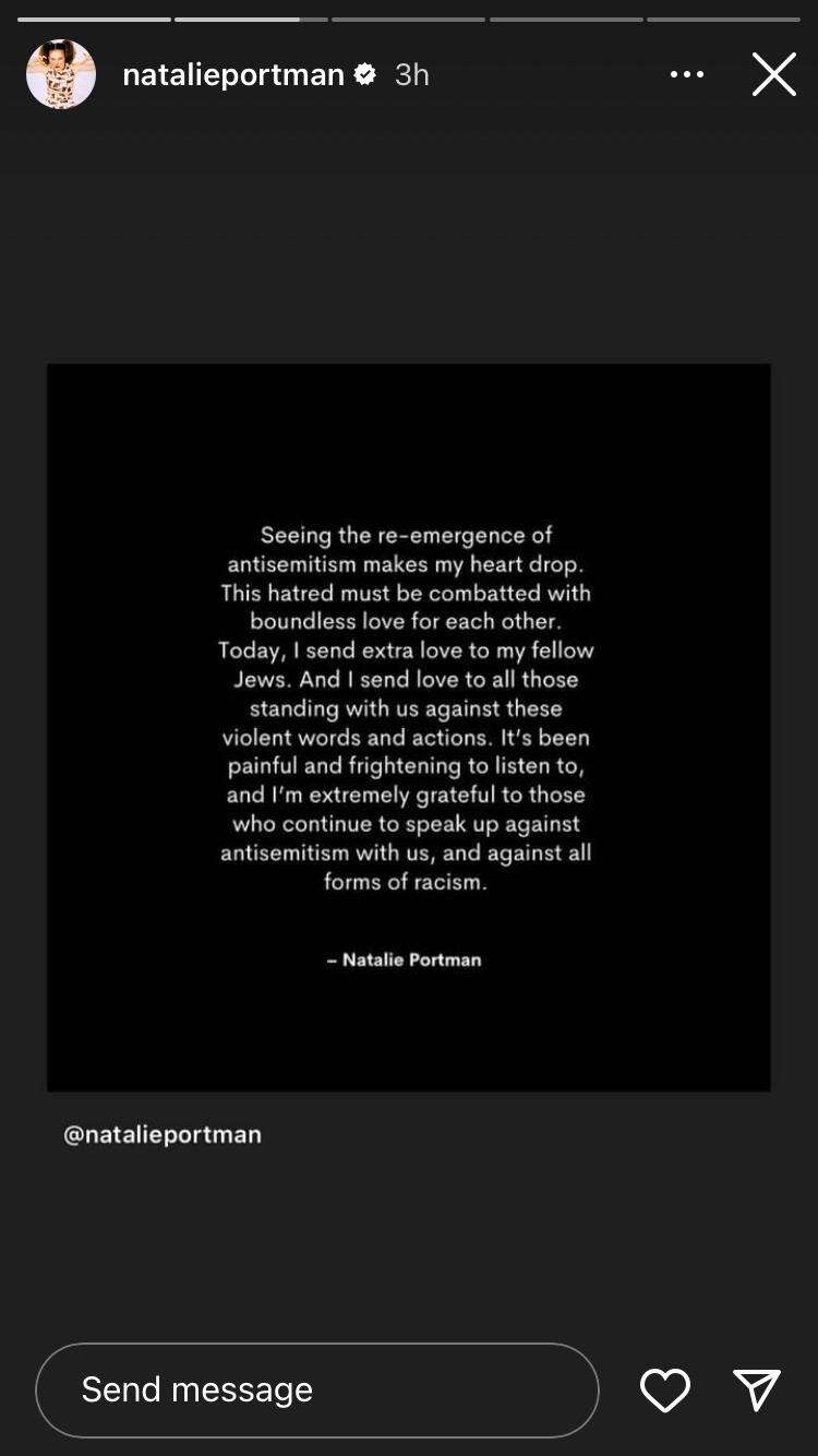 « Voir la résurgence de l’antisémitisme me serre le cœur », a écrit Portman dans la douleur. « Cette haine doit être combattue avec un amour sans bornes l’un pour l’autre », a-t-elle conclu. « Aujourd’hui, j’envoie un grand amour à mes frères juifs et à tous ceux qui se tiennent avec nous contre ces paroles et actions violentes », a-t-elle ajouté. « C’est douloureux et terrifiant d’entendre cela », a-t-elle partagé . « Je suis reconnaissant à ceux qui continuent de s’élever contre l’antisémitisme et contre toutes les formes de racisme. »